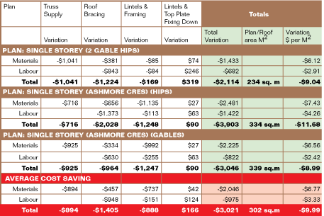 Roof bracing design is determined by the designer. It has been found that it is common to “over brace” roofs which incurs additional cost. By referring to the appropriate tables and specifying roof bracing to the minimum, good material savings can be achieved in this area. Additional labour savings for roof bracing could also be achieved if builder’s payment methods accommodate this.
