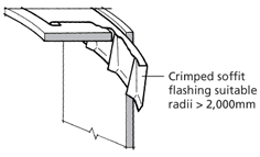 Where a curved soffit meets a vertical wall, the flashing can be 'gear crimped', crimped as shown or lockseamed. (See Crimped Flashings and Jennied Flashings,)