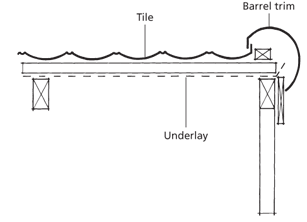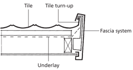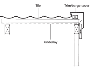 Tile ends are turned up a minimum of 40 mm and installed against a batten that will be covered by a barge cover or under a metal fascia. If a hidden gutter is used, tile edges should be turned down into the gutter by a minimum of 20 mm.