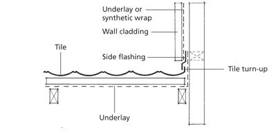 The flashing should finish 15 mm beyond the tile head lap above the penetration and should be wide enough to cover the nearest tile rib or up-stand. When the construction is solid masonry or brickwork, and flashings cannot be installed under the wall cladding, a chased should be cut and an over-flashing installed in the chase to provide weather protection.