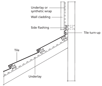 Flashings at the ends of roofs, where the roof does not end past the wall, require a diverter that ensures water is directed into the gutter. Sufficient material should be left standing out from the wall so that cladding installers can ensure a weatherproof finish.