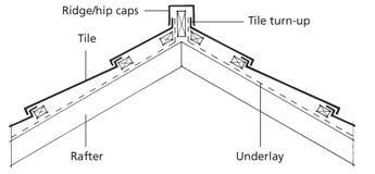 Tiles should be turned up against the battens or hip board by a minimum of 40 mm. See 15.3.2.6.1A Ridge and Hip: Short Trim Installation and 15.3.2.6.1B Ridge and Hip: Long Trim Installation.