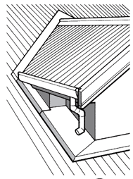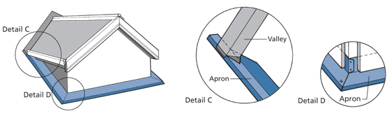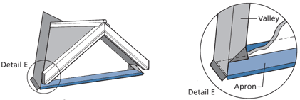 • The valley is carried past to overlap the apron and is folded down to weather and birdproof the transition, making the apron an extension of the valley.