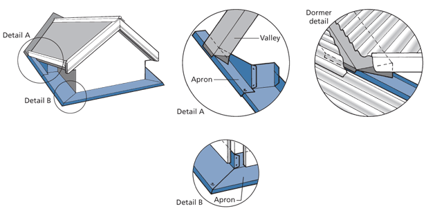 • Where the dormer finishes at the wall line the apron can drain directly into the gutter.