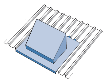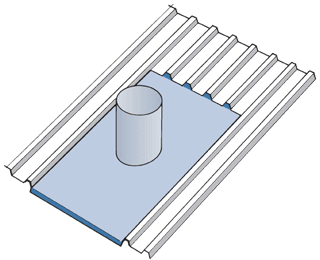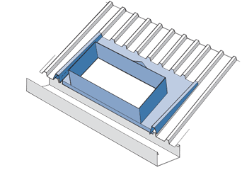 If the penetration opening falls between the gutter purlin and the penultimate or next purlin up the roof, a flat tray under-flashing can be used to drain directly into the gutter. The tray can be weathered under the ribs or over the ribs if the sheet is cut, but requires additional structural support.