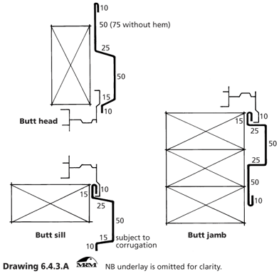 These details are known as butt flashings and can be used on flush or recess designs with a one-piece jamb. They are only suitable for areas with low or medium wind design loads, or in protected areas and require precise design, measurement, and manufacture to provide a weathertight solution.