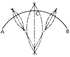 A line drawn through the points of intersection will bisect AB. This method can be employed to divide the arc into any number of even parts by repetition. Further, the method may be used to find the centre of any given arc by further bisecting AC and CB.
