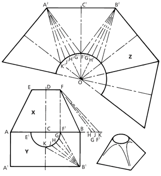 Draw the elevation X with base diameter AB, the vertical height CD to the desired cone angle and add the section line EF to the elevation. With centre D and radius DA describe a semicircle Y on the base, and divide the circumference of this into six equal parts.
