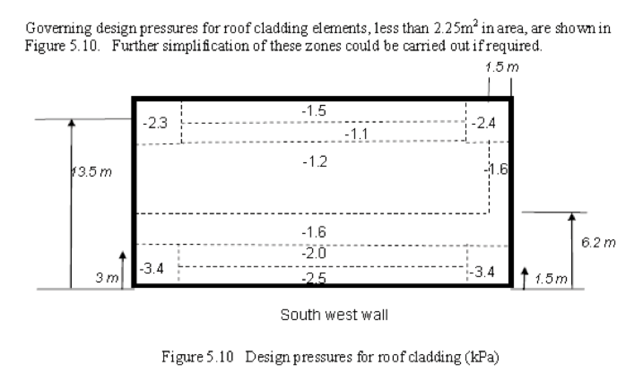 For the body of the roof, the wind design speed is given as 42.8m/s (see table above), which equates to the 1.1kPa on the area shown in Fig. 5.10.