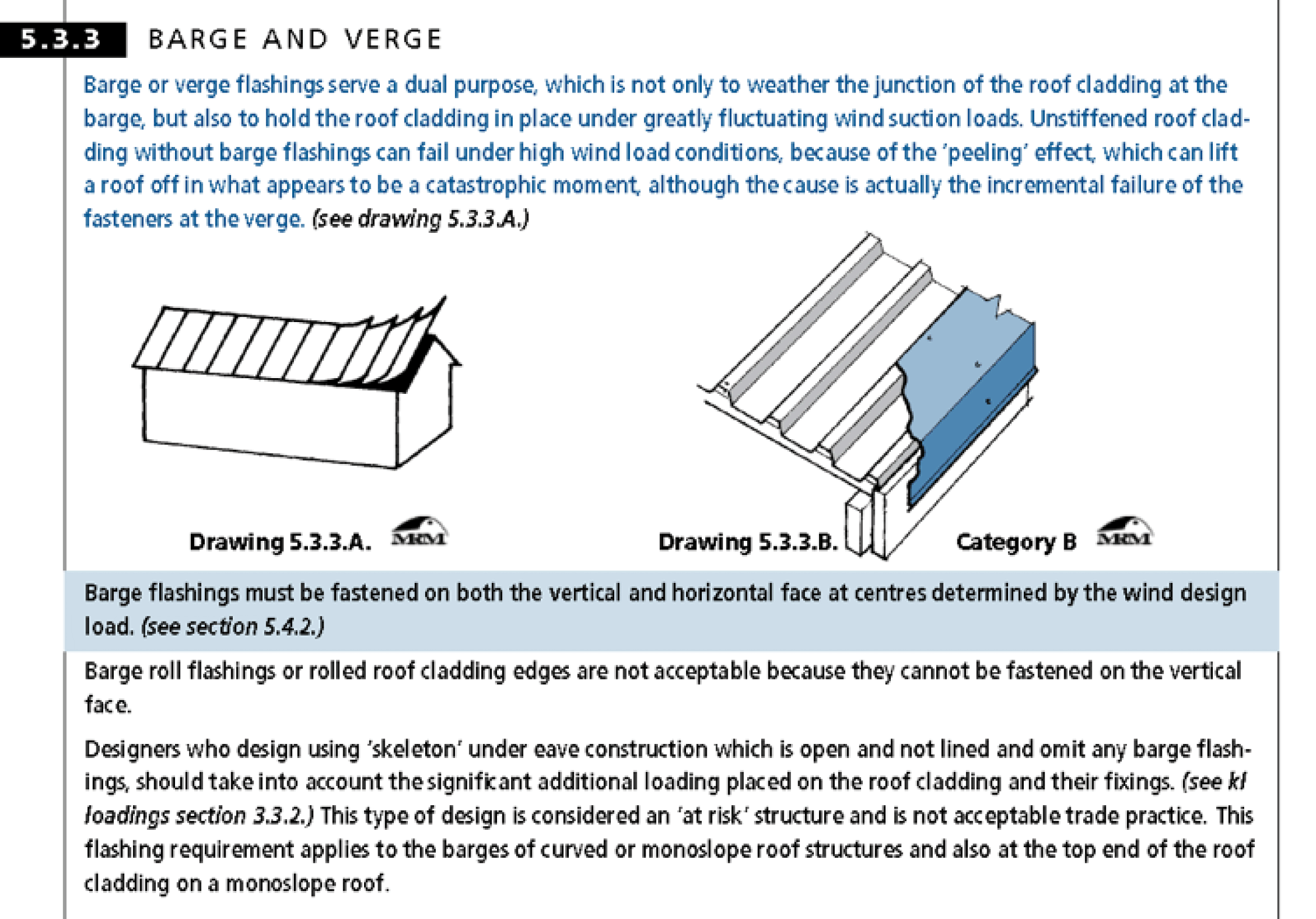 Of particular importance are the corners of the roof of the building when the pitch is less than 10°. AS/NZS 1170: 2011 (our New Zealand loadings code) calls for a much higher load factor of Kℓ = 3 for roof and wall cladding corners; this does not need to be a problem because the tested wind load for corrugated and trapezoidal profiles and their fastening patterns are given in Section 3.9 of the NZMRM Code of Practice. What it means is that the corners of roof and wall cladding fastening pattern should be increased but, more importantly, barge flashings require double fixing.