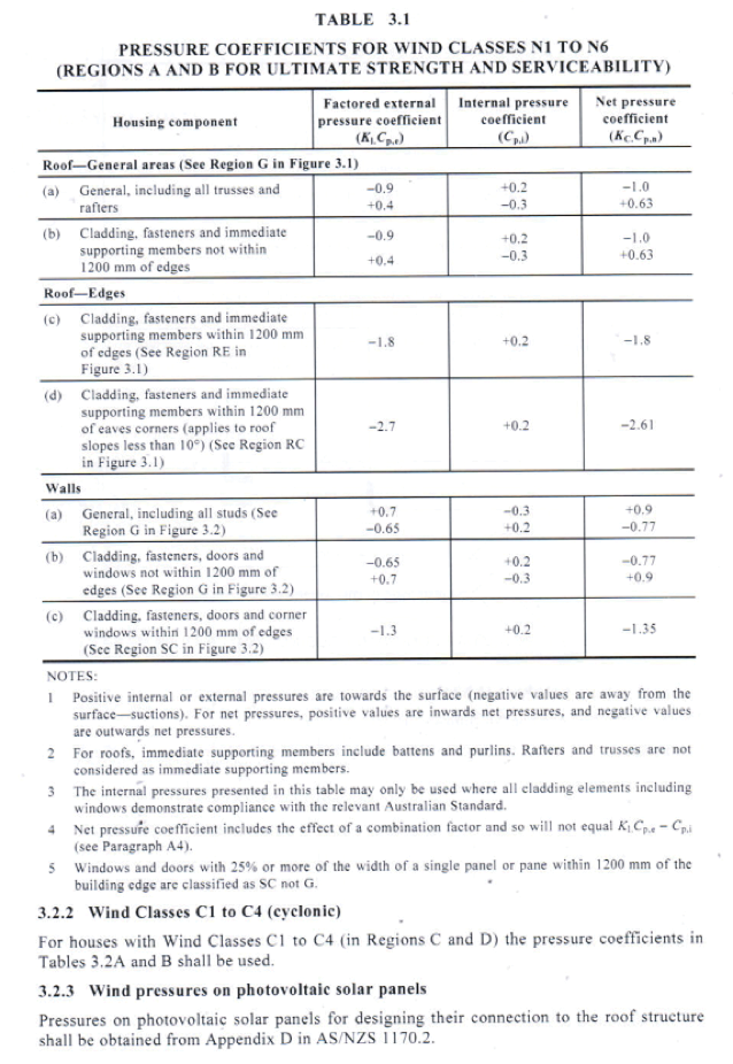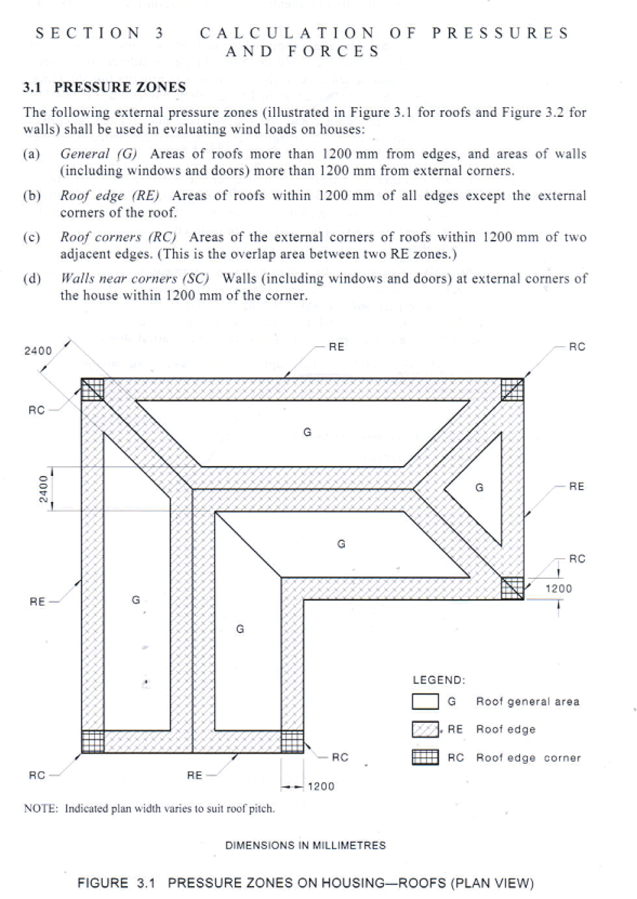 Australia’s Standard AS 4055 ‘Wind Loads for houses’ takes a more pragmatic view and gives a Kℓ peripheral figure for distance of 1.200m, but still has different pressure coefficients for the corners of the roof and the walls. It does appear to include the roof corners, no matter what the roof pitch is, but also limits the combined net coefficient to 2.61 for non-cyclonic areas (see Table 3.1 of AS 4055, below).
