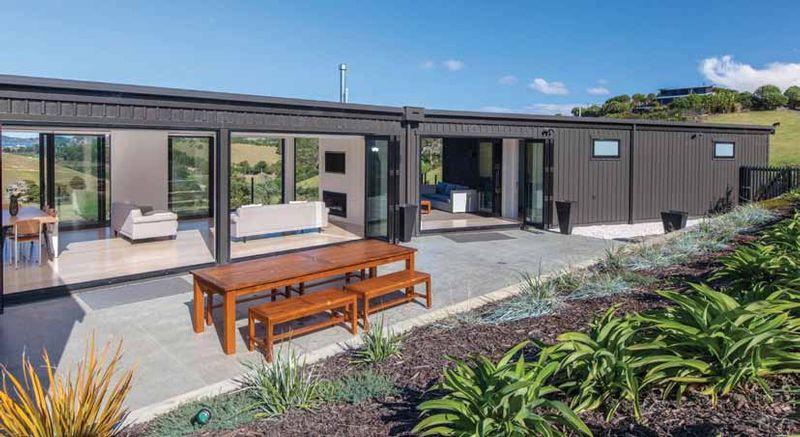 Pataua Development in Whangarei, located on a large rural site. The clients, who are based overseas, requested that we create a master plan for a large rural site in the Pataua Development, Whangarei. A vision that could be brought to life in stages. The site consists of two key developments. At the road side, on the flat, the summer house and boat shed structures alongside the tennis court. Higher up, at the back of the site, the new house has been designed with a master bedroom wing, a living wing and a bedroom wing, stretching across the site to maximise the views of the surrounding valley and ocean. A retained courtyard to the rear of the house creates an ideal entertaining area, capturing the afternoon sun. The house is clad in a mixture of dark stained grooved ply and dark vertical profiled metal cladding.