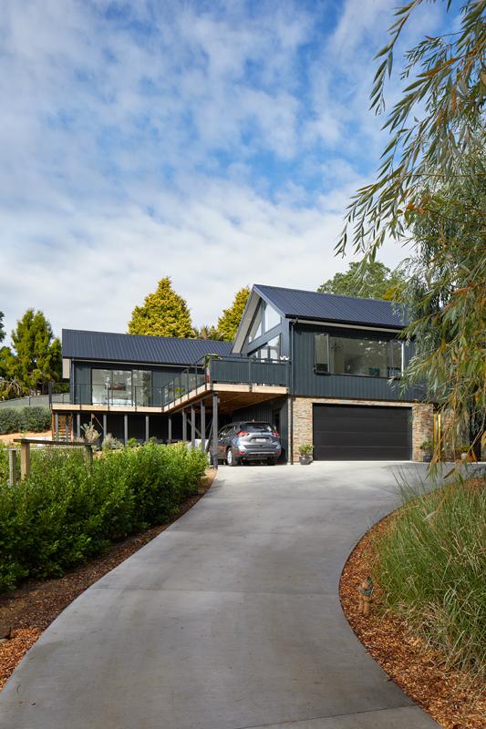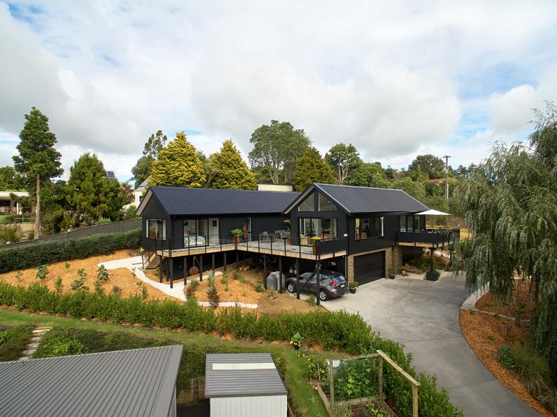 The lounge features two triangular-shaped windows at one gable end providing a large glass frontage offering views to the estuary beyond. Timber decking on three upper floors of the home also capture the sun and allow further appreciation for the Northland environment. James Hardie Linea Oblique vertical weatherboards match the T Rib roofing lines of the roof, a profile offering a more traditional finish.