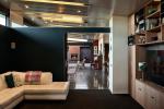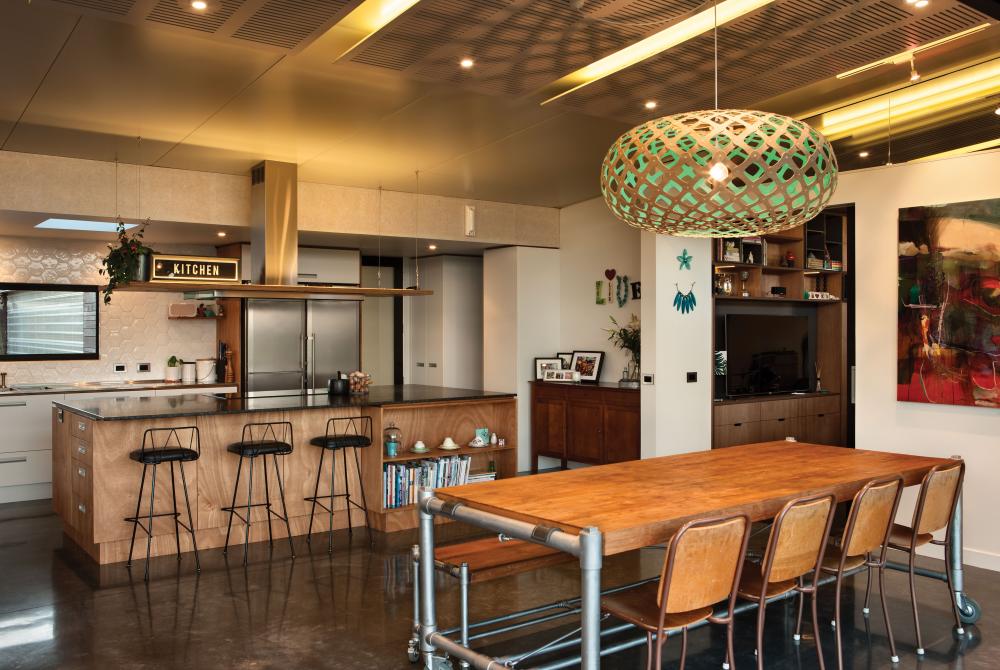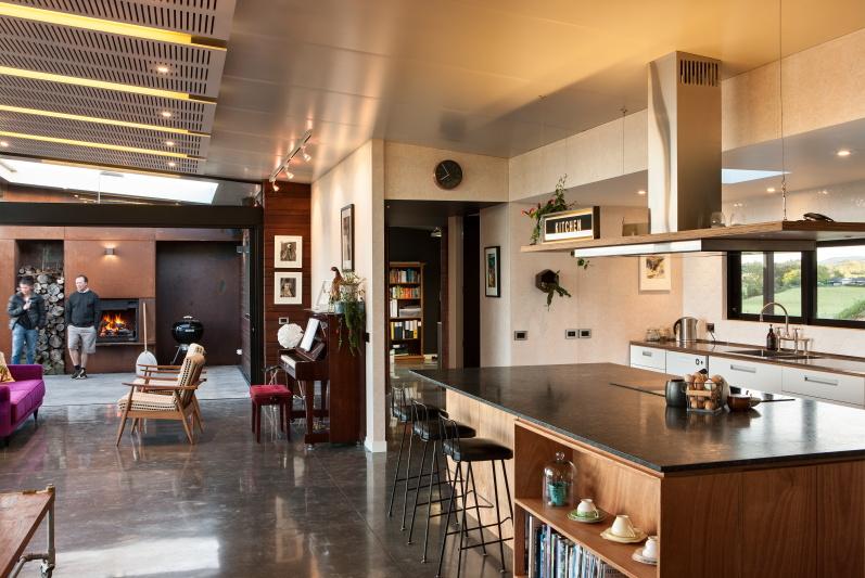 Inside, the home has an insulated polished concrete slab floor while acoustic panels have been placed overhead to cut down on noise. The panels also house downlights.