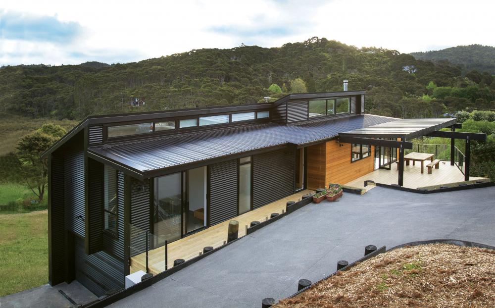 In keeping with the couple wanting a low cost, low-maintenance home, they chose Dimond Corrugate in ColorCote MagnaFlow for the cladding with some cedar weatherboard accents.The Dimond Corrugate in ColorCote MagnaFlow was chosen for its resistance to sea spray off the harbour and the ease with which it can be washed down to maintain the pre-painted surface.