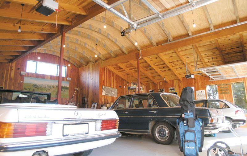 After some consideration it was decided that a barrel vaulted ceiling in the garage would best house the launch. This would be continued at a right angle in the lounge, with lean-too roofs. This was enhanced by having the central vaulted ceilings lined with T & G sarking which featured exposed rafters with sarking over in the wings.