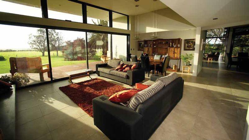 The lounge is glazed on two sides allowing views of both the atrium and the wider farmland. The generous double glazed sliders give access to the adjoining, covered deck increasing the entertainment capacity and flow. The kitchen is centred around an island bench with a breakfast bar and lounge space to relax or