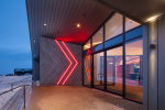Along with the playful LED lighting, Roofing Industries’ Eurostyle™ Interlocking wall and soffit panel helps to create an impressive entry.