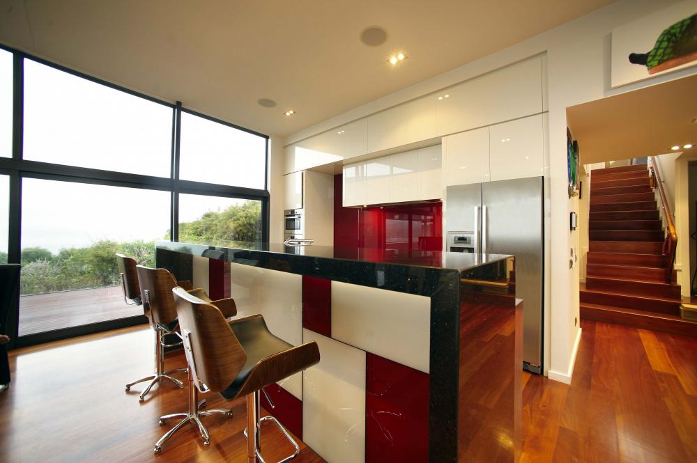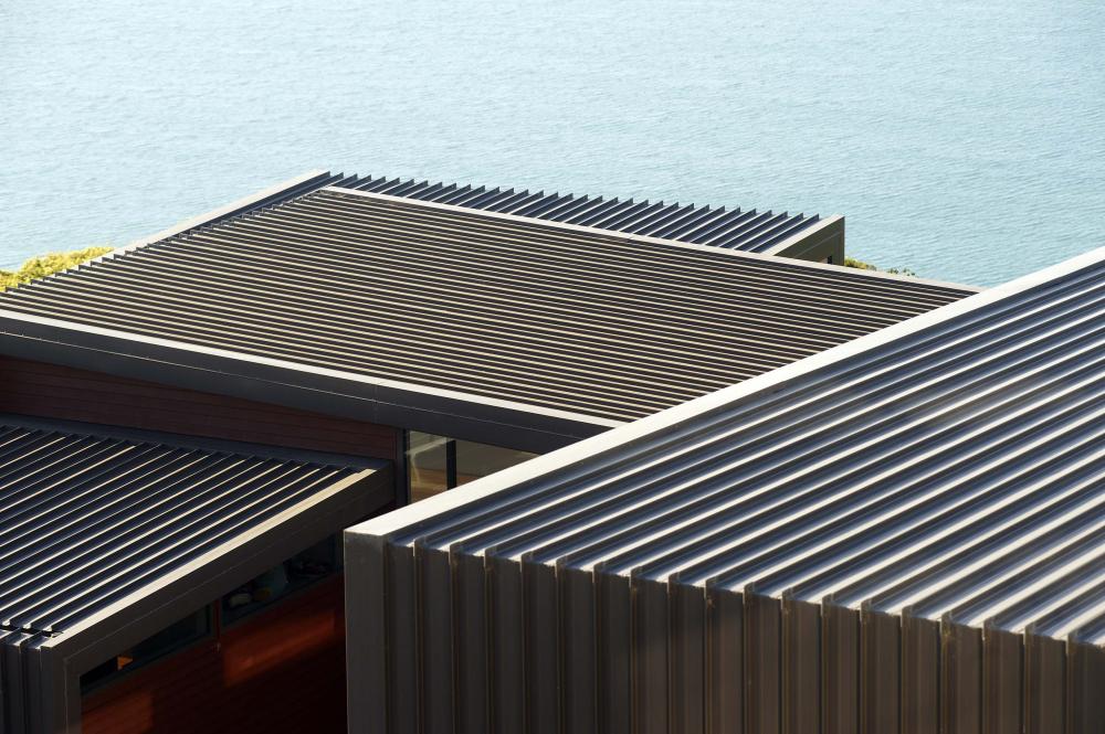 Natural materials were used to help blend with the environment and compliment the COLORSTEEL® cladding. Hardwood decking, schist, cedar weatherboards, timber retaining walls and locally sourced exposed aggregate concrete for the driveway all added texture and softened the overall effect. Strategically located schist walls are inspired by the rocks from the local cliffs and the COLORSTEEL® roof and wall cladding, grey tinted glass and the aluminium joinery also reflect the pallet of the indigenous the rocks and landscape in the surrounding natural environment.