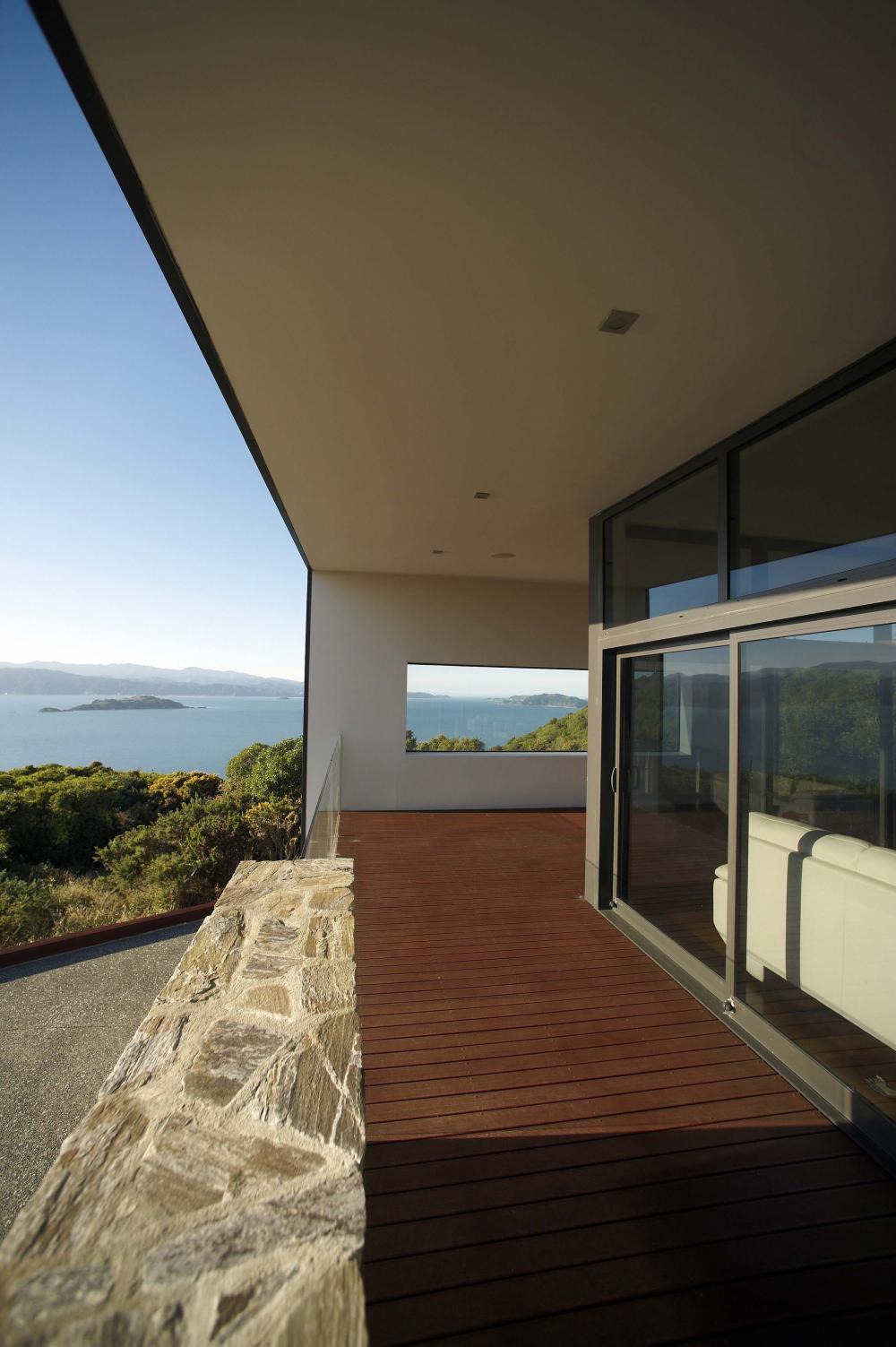 Flowing up from the entry hall and lower steps is a second straight flight of steps to a private, fully east orientated bedroom block which includes three double bedrooms with the main bathroom. A glazed hallway towards the west connects the bedrooms and bathroom. From this hallway there is easy access, via large sliding glass doors, to the sheltered western deck. The top three bedrooms open onto the eastern terraces with the view towards Wellington harbour.
