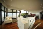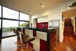 Close to the top of these stairs is access to the sheltered North courtyard and on the opposite side another, semi covered and partially enclosed outdoor living area. On this level is a formal lounge that open towards the courtyard that enjoys the rising sun in the east. When required the lounge can be fully enclosed by large sliding glass panels and doubles as a home theatre.