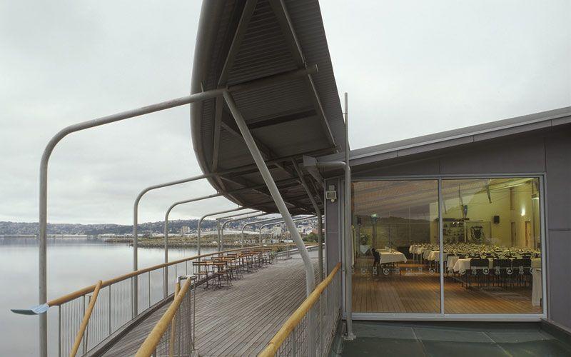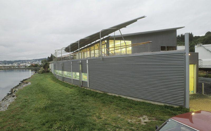 The site - a public reserve close to a seawall - is subject to strong southerlies and salinity is high. Building forms and materials were specified for this microclimate, and details and materials are unique to the building’s uses. Views of the harbour are carefully presented to connect building users to the water. Colours and forms are intended to recede into the immediate context, especially when viewed from across the harbour. The aerofoil roof reduces sky glare and enhances the view of the harbour.