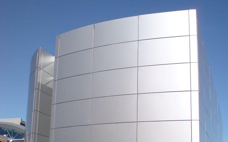 The combination of the silver interior of the curved main frontage and the black-grey trapezium sheet metal, with perforated side surfaces and acoustically filled cavities, provides optimum soundproofing to the ceiling. The Grey Steel structure and white ceilings provide contrast
