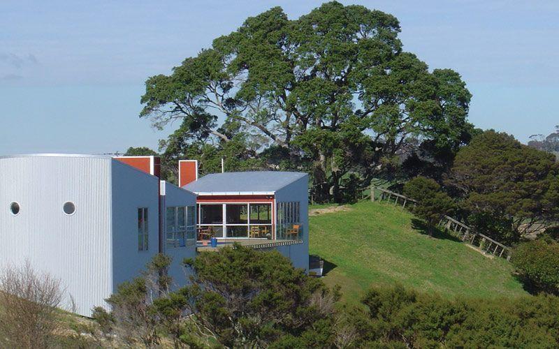 The clients Margaret and Murray Bond purchased this small life style block on the edge of Cockle Bay, Auckland because of it's position and views. The site is a hillside paddock, accessed by a ridge track with grassy south facing slopes that fan out towards a lower edge of native bush. There is a prominent Pohutakawa tree that marks the sites eastern boundary, and adds to the sites relaxed coastal feel. The site has panoramic views of Whitford, the Maungamaungaroa