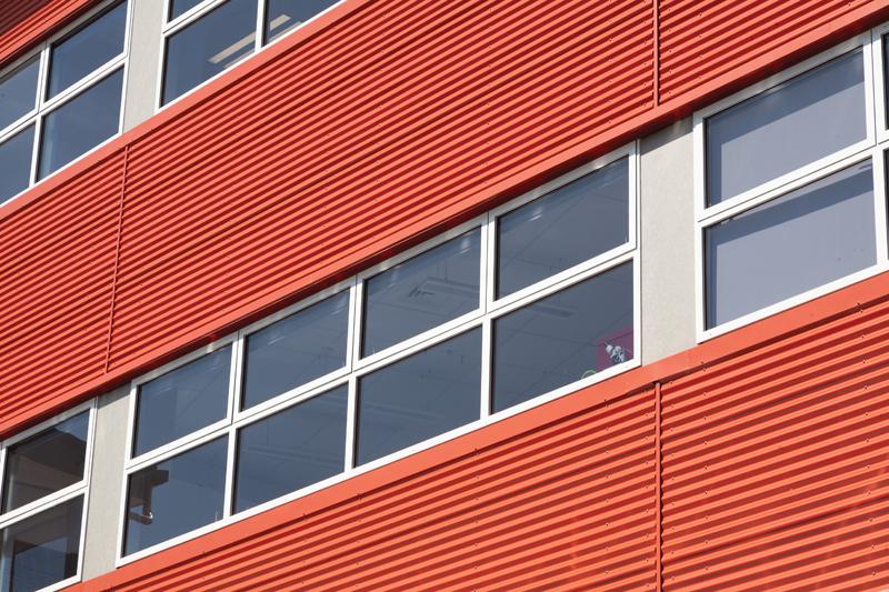 Pre-finished long-run metal was chosen for the large mono-pitch roof area with horizontal and vertical metal cladding in combination with pre-finished fibre cement sheet and aluminium joinery on the upper levels, and predominantly pre-cast concrete at ground level for robustness.