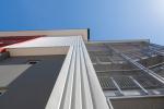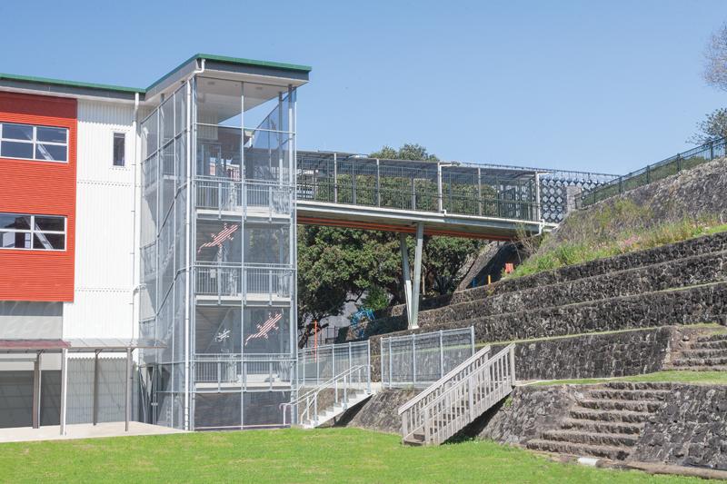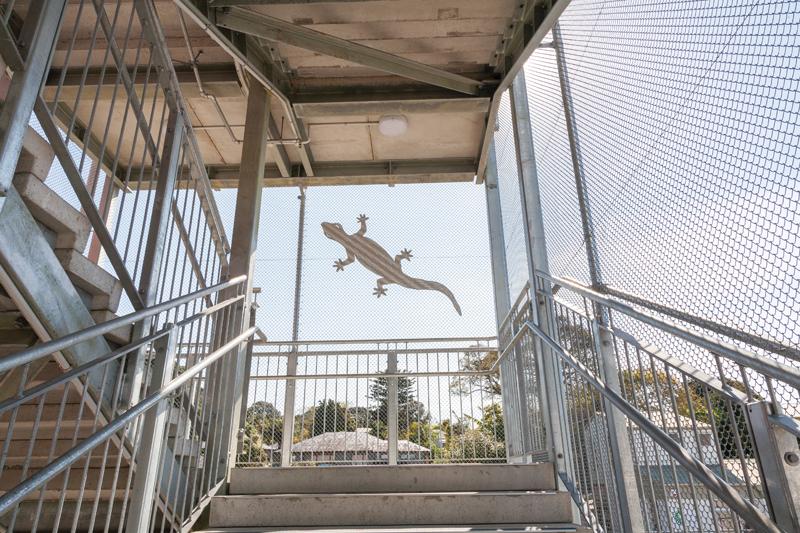 The external stairs are pre-cast concrete landings and treads on an exposed galvanised steel frame. The stairs are covered in using a galvanised mesh external screen — which the school has since decorated using corrugated steel geckos.