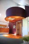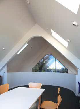 Above the reception is a mezzanine common room for staff to meet and unwind. This is a very pleasant, informal retreat with a curved internal balcony, beams and extensive views to both front and rear providing a change from exacting dentistry in hygienic surgeries.