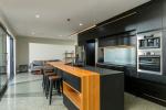 With four bedrooms and three bathrooms in a 260m2 floor plan, you might expect things to feel compact on the inside, yet it’s far from the case. Thoroughfares and living spaces are generous, open and well lit, with the function and flow you’d expect in a home designed by professionals. The sleek, modern interior is dominated by light and dark greys, natural wood tones and black, also contrasted by tasteful splashes of orange which provide an added edginess and personality. A polished concrete floor throughout the home is a feature in itself, the bathrooms are on trend, and a deluxe kitchen boasts the latest appliances and tapware as well as a breakfast bar and walk-in pantry.