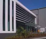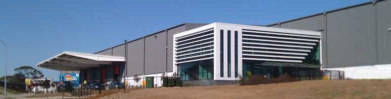 The office was designed as a simple rectangular form and is positioned in a corner of the warehouse to make it a focal point and to help minimise the bulk of the building. It also helps to bring some human scale to the building with the use of elements such as horizontal louvres, a glass canopy at the entrance, fencing and landscaping.