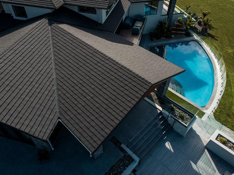 Once the design was in place, the material choice was an easy decision to make. Graeme chose Gerard’s CF Slate profile, a slimline roof tile system made of a core of Zincalume®, coated in proprietary protective layers and finished in a natural stone chip coating with overglaze. In the final design, the CF Slate tile roof was accompanied by external gable support posts finished in a natural slate cladding. Graeme says of the design, “That shingle type roof was just something that I really loved and being able to find it in a metal form to get the strength and durability of steel was just the ultimate.”