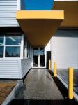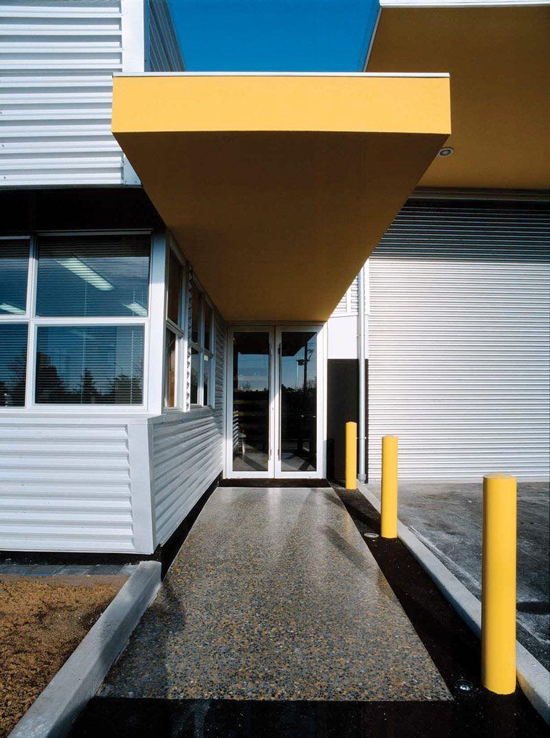 The exterior colours are bold; in keeping with the industrial use. This helps a relatively small building stand out in the larger asphalted environment around it. Yellow and grey are the corporate colours of Hynds and these colours work well against the metallic look of the Zinclalume© coated Dimond V-rib© wall claddings and Dimond Styleline© roofing.