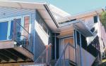 The foundation is of pole construction giving the lightweight building a suspended appearance. The variety of materials add to the texture and the interaction of levels and plains give the home interest and aesthetic appeal from every angle.