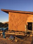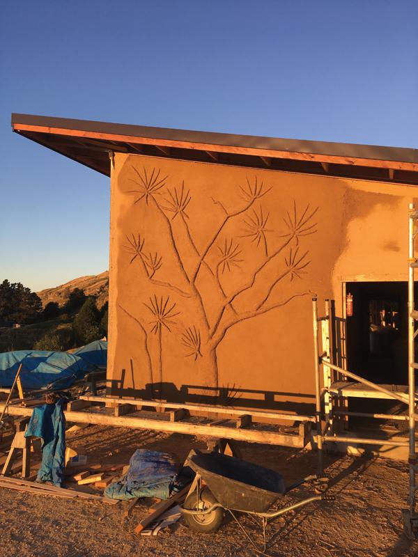 With great teamwork from the builders Pat and the RM strawbale team of Nils and Everett and the other trades, Bob and Geoff on electrical and Kenny (NZ master plumber of the year 2019) by July 2019, Andrew and Alessandra were able to move from their on-site caravan into the self-contained B&B flat within the main house - just 10 months from first breaking ground! Work progressed on completing the remainder of the house and they were able to move into the full house in October 2019. The oiled plywood soffits were finally added (the soffits were left to last to prevent marking from over spray from plastering the walls) and the cabbage tree artwork on the western wall of the house, inspired by another of Pat’s strawbale home builds, looks fantastic with its lime plaster finish coat.