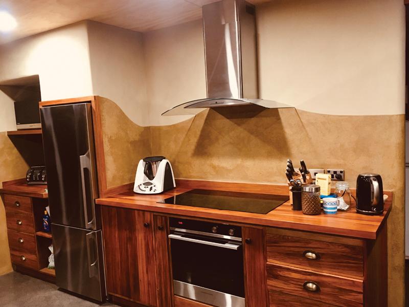 The external 450mm thick strawbale walls were plastered with a 35-40mm base coat of clay plaster on both sides. The final lime plaster finish on the exterior is more durable and resistant to erosion and rain. The internal clay plaster finish is easier to work with than the exterior lime finish and has reported health benefits in terms of humidity control, is negatively charged and releases no toxins. In addition to the natural beauty, the plaster system is a great insulator for heat/sound, it is airtight but allows vapour to move in/out of the walls and last but not least it also adds to the thermal mass of the house. Repairs to the interior clay plaster and exterior lime plaster finishes are simple and Pat leaves his owners with a manual so they can affect any repairs that may be needed.