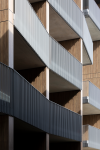 The taller apartments provide a buffer and protect the wider precinct from the traffic and the prevailing, colder north-east winds. These factors influenced the design and layout of the development with all apartments having west-facing living and outdoor spaces.
