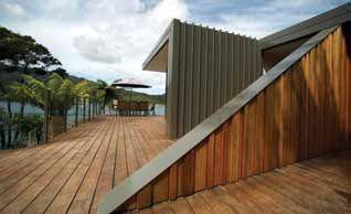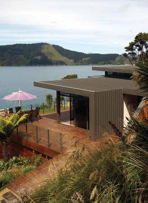 Structurally, the bach is a singlestorey steel and timber framed structure with skillion roofs, seated at the front on timber piles and at the back on concrete slab with a 1 metre-high concrete retaining wall and footing along the entire length. The home is double-glazed and has exterior aluminium joinery.