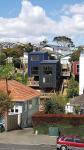 The home is arranged on the slope so that the upper two-storey wing is a level higher than the offset lower two-storey wing, creating a three level home with the wings joining at the middle level to create a large open plan living area, with two bedrooms and a bathroom on the top level and the same again on the bottom level. The roofline is gently gabled.