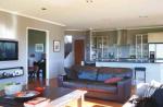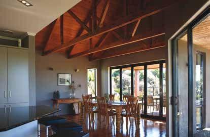 Adjoining the family room is a formal dining area which also looks out over the countryside and deck / pool area. A feature of the dinning area is the natural sarked roof and beams that follow the high-pitched contour of the roof above. The natural timber gives a warmth and ambience to this area. From either the front entrance or the dinning area guests can access the formal lounge that has a stud height of both the upper and lower level and can be viewed from the mezzanine above.