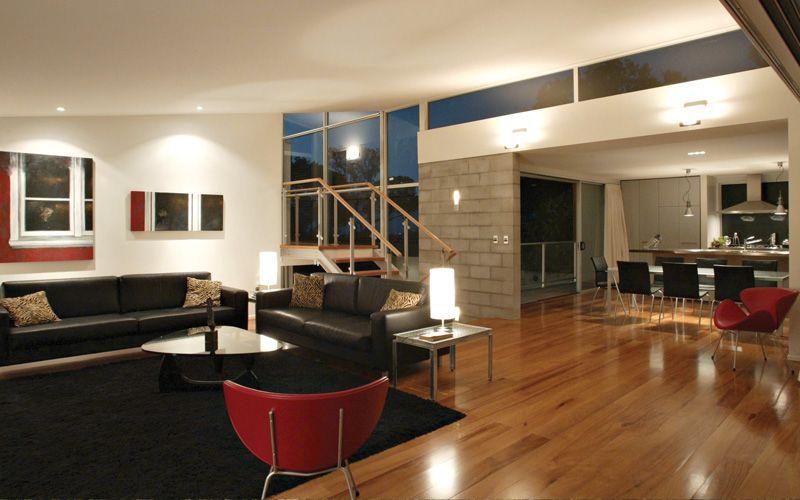 In addition, polished concrete floors where chosen over other softer materials for its energy efficiency with heat transmittal from afternoon sun. Each of the three half levels are connected by half flights of open tread stairs, making the pool area only a quick exit from living areas. It was important to the brief for private open space, such as the pool area not to be disconnected from the kitchen, living, dining. From the kitchen both walls slide back allowing the island bench to float in the room between views North and South.