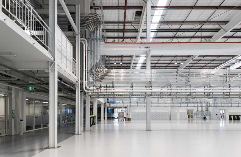 Tapered steel portal frames with high gloss enamel paint were used to provide clear spans of 80m between columns. The portal structure in the production area allows for the use of gantry cranes that can be removed in future to allow this area to be used for storage and racking.