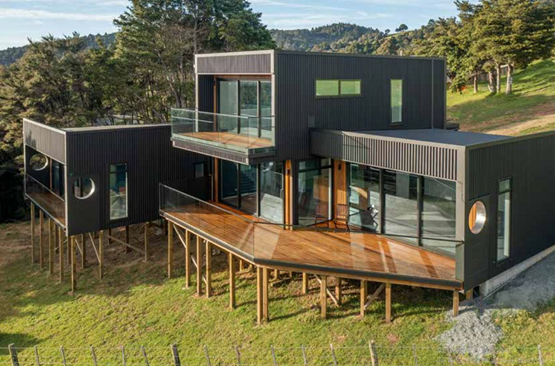 An inspired feature of this home relates to a stand of the native conifer totara trees within the building footprint, four of which had to be removed. The durable timber was utilised by Matt, to be milled, dried and included within the design providing timber accents to the interior. Circular openings in the exterior wing walls have been lined with harvested totara timber to conceal the flashings and the interior of the home features totara on the treads of stairs throughout the house and on shelving. 140mm thick timber wall frames were utilised to provide better thermal performance – to help counter the effects of heating from dark colours, and to add depth. Noise reducing gib boardings throughout the downstairs sections of the build has been included to further enhance the privacy of guests in the Airbnb. Garapa timber decking was used on the north facing decks while the cantilevers from the upper floor provide some shade and protection from the elements.