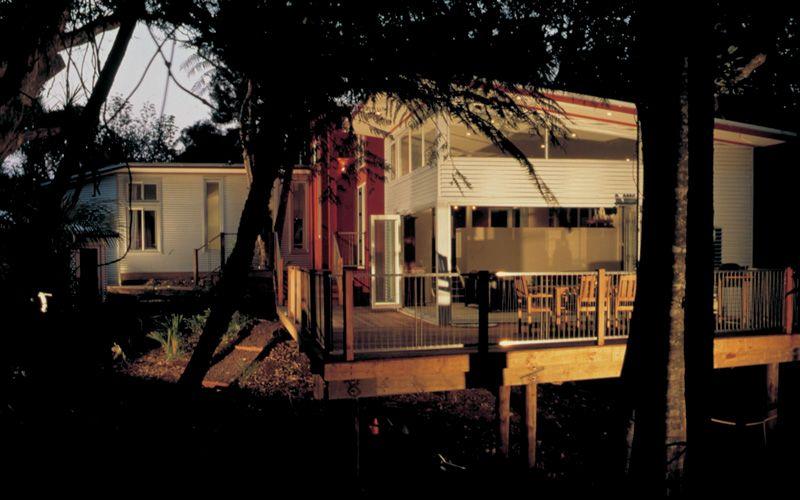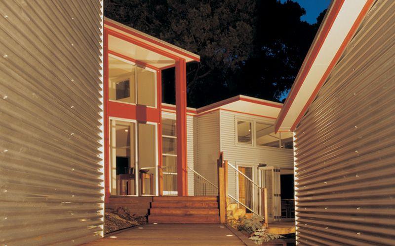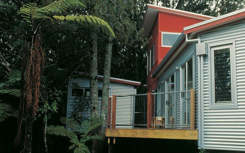 Another concern with a dense bush site, particularly not being on town water supply, is the maintenance of the building in the future. Materials were chosen to clad the house that are economic and require minimal maintenance. The bulk of the house is clad with zincalume, and then to link the two wings and to visually contrast with the zincalume, the central two-levelled block is clad with plywood and battens stained a rusty red.