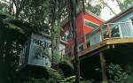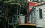 In order to enter the house at a suitable part of the house, a raised timber board-walk was created to link the garage with the main house. In time the board-walk will float amongst the ferns and palms as they regenerate and fill all the gaps.
