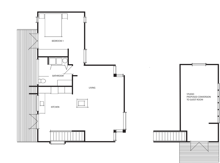 Both Gary and Maddie have fine arts degrees and practise as artists. As a result a studio was an essential part of the overall design concept. It was important that this be a separate workspace to think and create...unfussy and robust. The design is flexible and in the future it is intended that this area be converted into a guest room with a studio potentially being built above the existing garage.