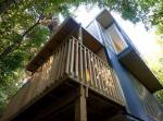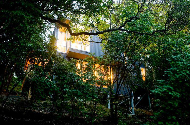 The main living spaces are virtually suspended in and above the canopy of surrounding trees - including the much-loved Walnut. This allows glimpses of the sea beyond and achieves the objective of living with the trees without impacting on the environment. In essence the house was sculptured so as to fit the