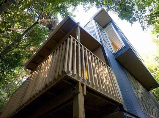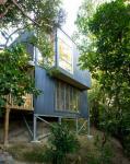 The house, which is split level, has a main floor area of 77m2 together with a lower floor studio space of 26m2 making a total of 103m2. The house has one large bedroom with the studio designed as a potential for conversion into a further bedroom. The maximum height of the house is 8.20 metres supported by galvanised steel columns and concrete pile footings that are typically 500mm square holes taken to a depth of between 500 to 1500mm into Greywacke and mudstone. The steel bearers and columns are braced diagonally.